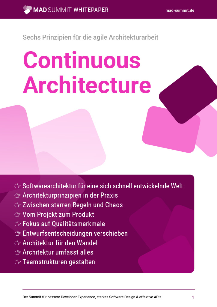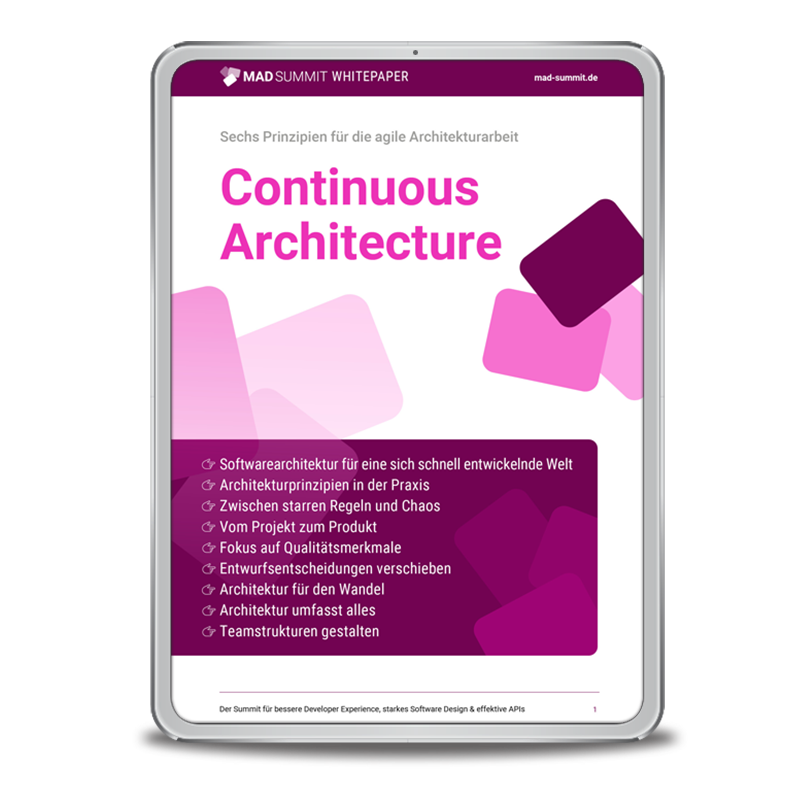Sie möchten Architekturarbeit effizient, nachhaltig und agil gestalten? Dieses Whitepaper zeigt Ihnen, wie Continuous Architecture Prinzipien in der Praxis Teams, Produkte und Prozesse zukunftssicher macht.
