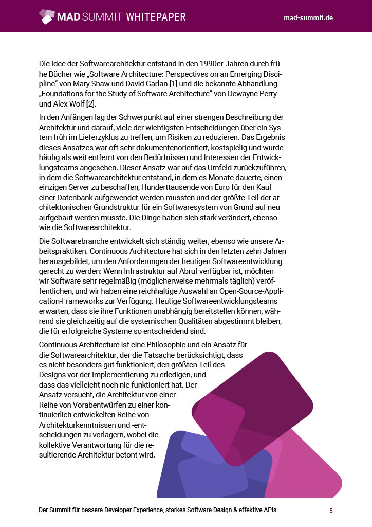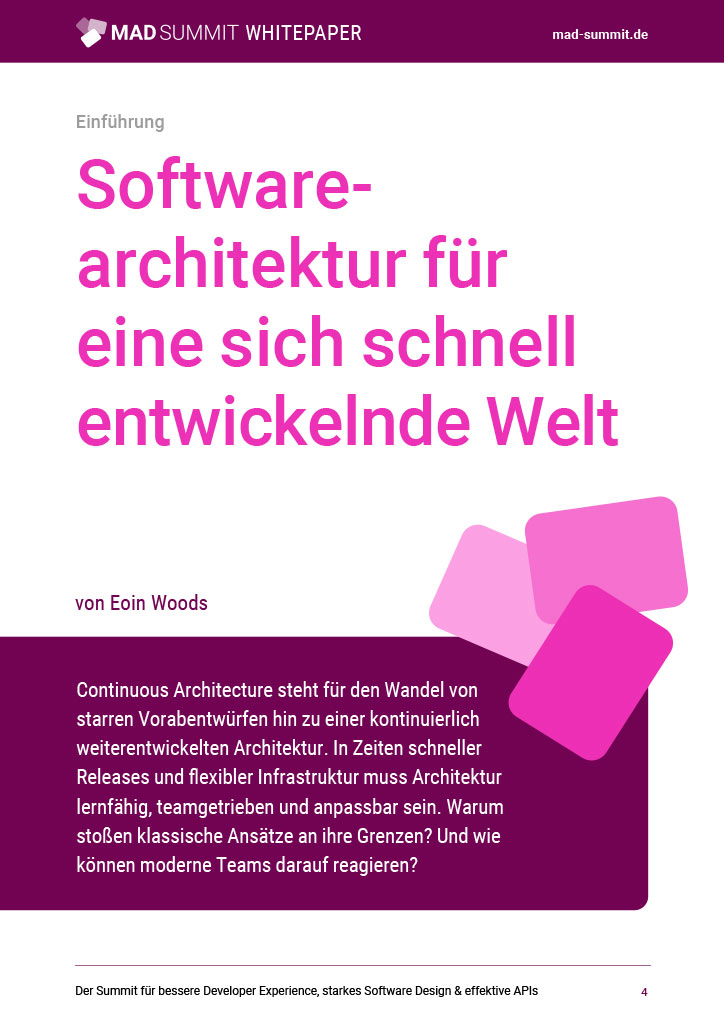 Softwareentwicklung ist heute schneller, komplexer und kontinuierlicher als je zuvor. Klassische Architekturentscheidungen, die früh und starr getroffen werden, können Teams bremsen und Risiken erhöhen. Dieses Whitepaper zeigt, wie Unternehmen mit den Prinzipien der Continuous Architecture flexibel auf Veränderungen reagieren, Qualität und Systemstabilität sichern und den Weg von Projekten zu nachhaltigen Softwareprodukten gestalten. Sie erhalten praxisnahe Einblicke, konkrete Methoden und Erfahrungen aus realen Projekten – für Architektur, die mitwächst und Teams unterstützt.